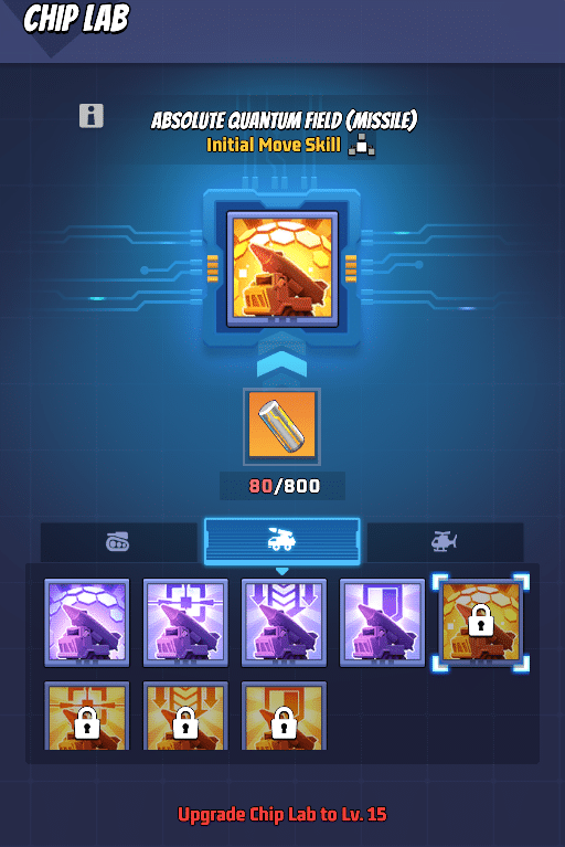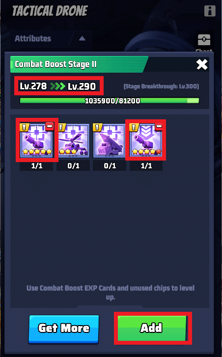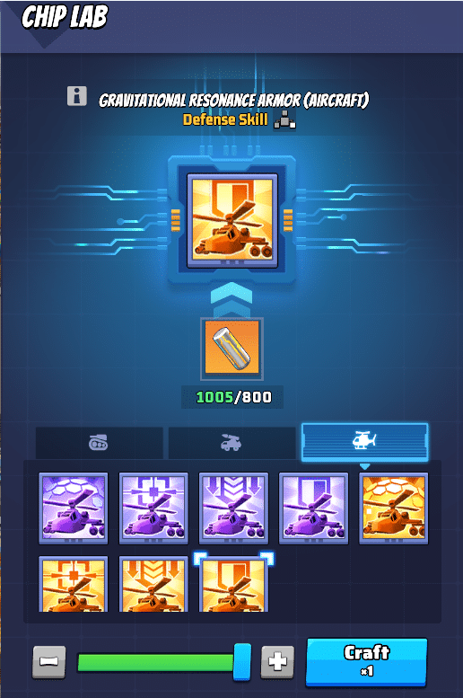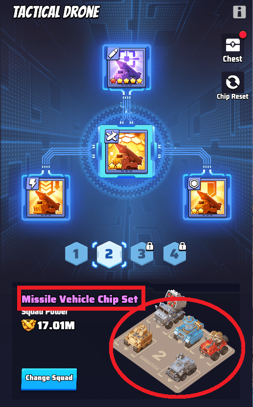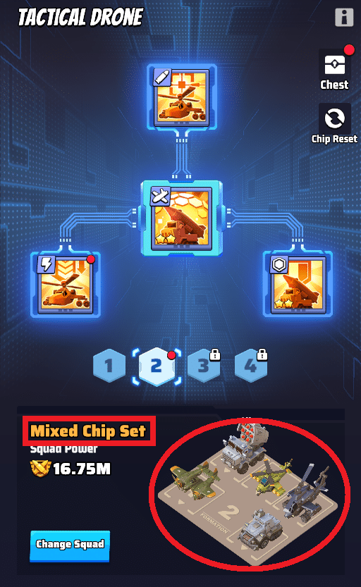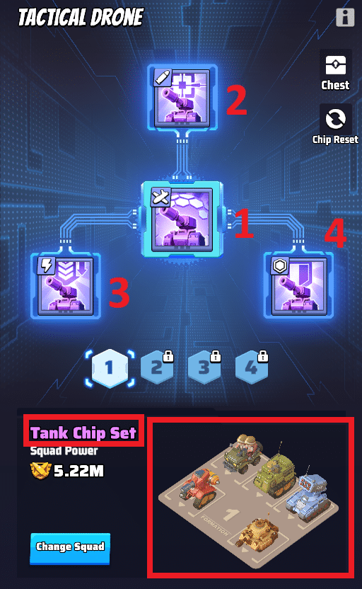 - Setze die passenden Chips gezielt bei Truppen im Drohnenzentrum (Flugzeug, Panzer, Raketenfahrzeug) ein, um ihre Kampfkraft zu verbessern.