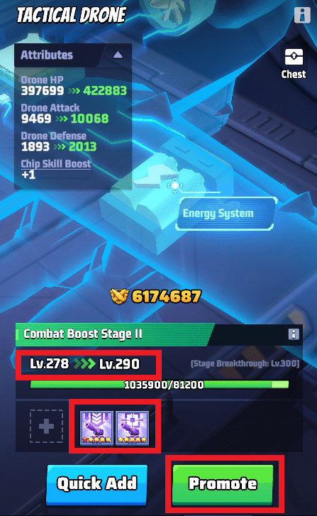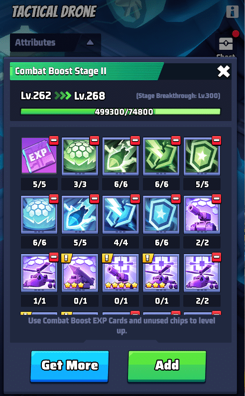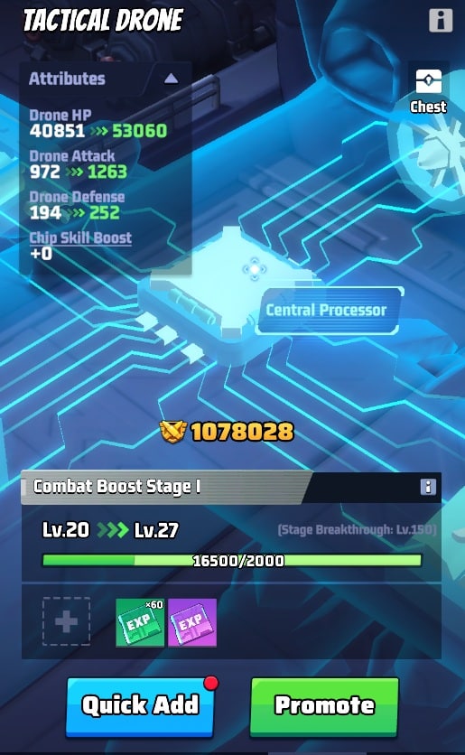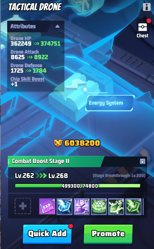 - Achte darauf, die Chips deiner Drohne gleichmรครig aufzuwerten, anstatt dein gesamtes Chip-Material in nur einen einzelnen Chip mit hohem Level zu investieren.
